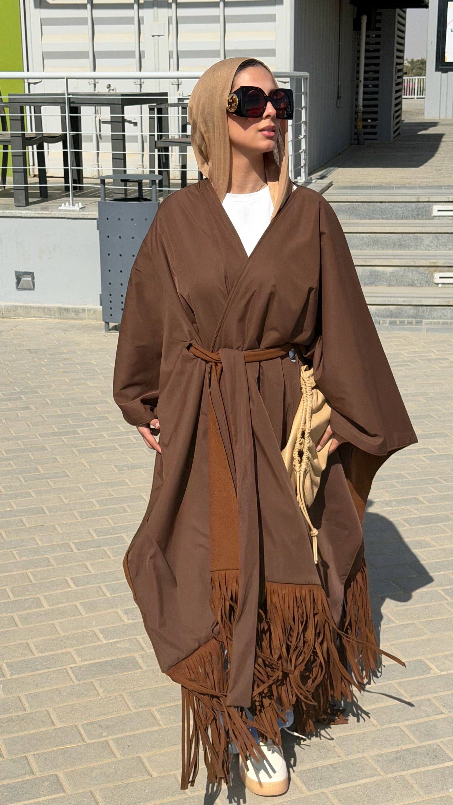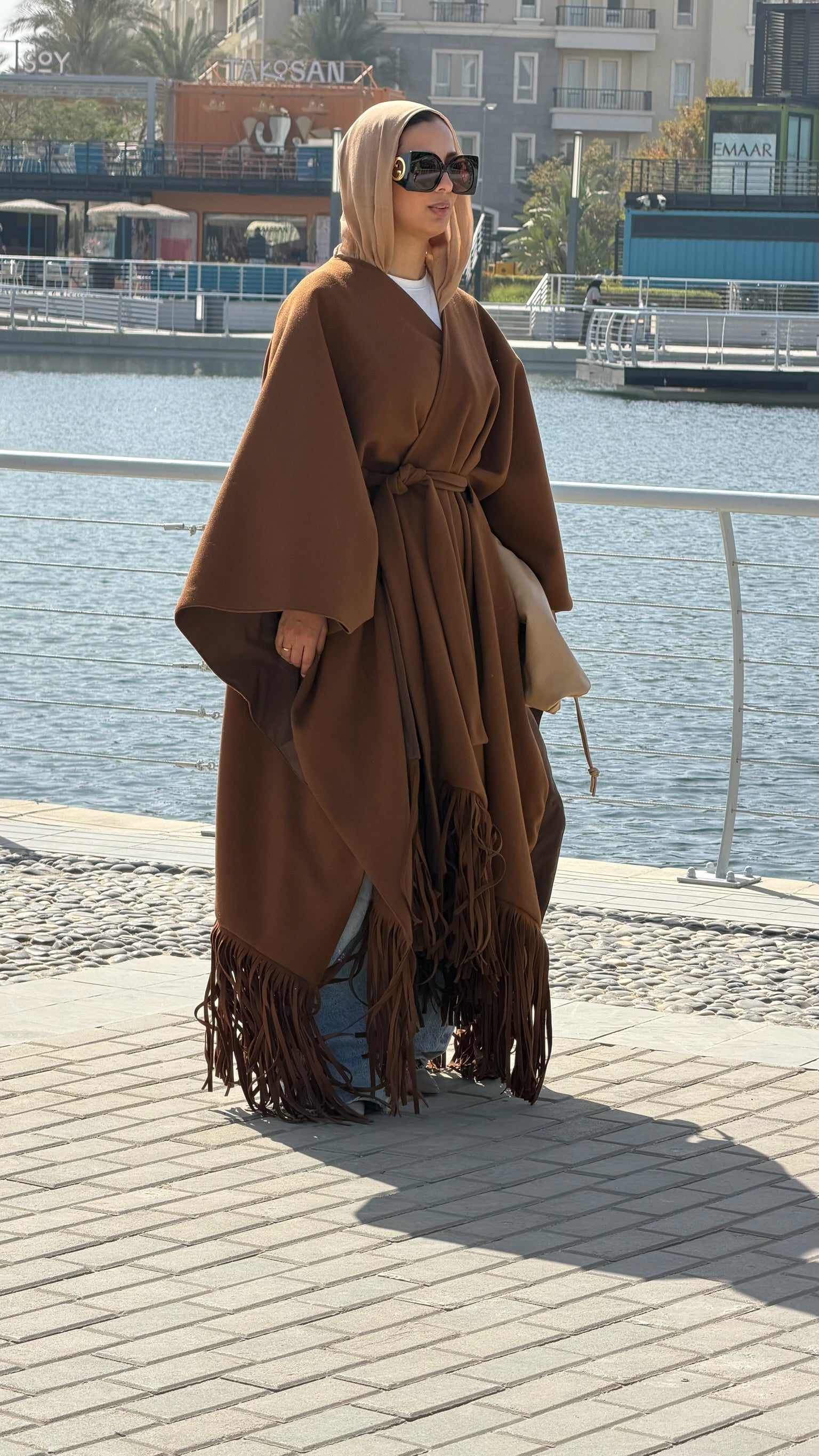 Reversible dream in deep brown—cozy wool meets waterproof ease, finished with fringe movement that adds quiet drama. Belt loosely, let it flow, wear it whenever. One size, forever chic. Beyond seasons, beyond occasions
