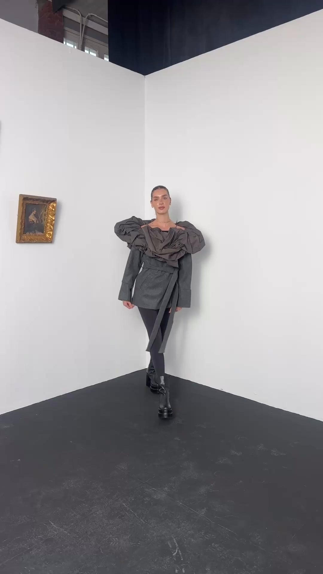 The Gaga Jacket is a striking, oversized statement piece made from premium heavy-weight wool felt in deep charcoal gray. What sets it apart is the massive, built-in ruffled collar (an enormous, cloud of lightweight water-repellent waterproof material that explodes upward and outward, framing the face and shoulders in dramatic, gathered layers). The body is clean and tailored: a wrap-front silhouette with structured set-in sleeves, wide turned-back cuffs, and a long matching self-belt to cinch the waist and balance the volume. Minimal seams, hidden closures, and a subtle contrast between the rigid felt and soft taffeta create effortless high-impact style. Wear the collar high for full drama or let it soften for quiet power. One size, endless presence.