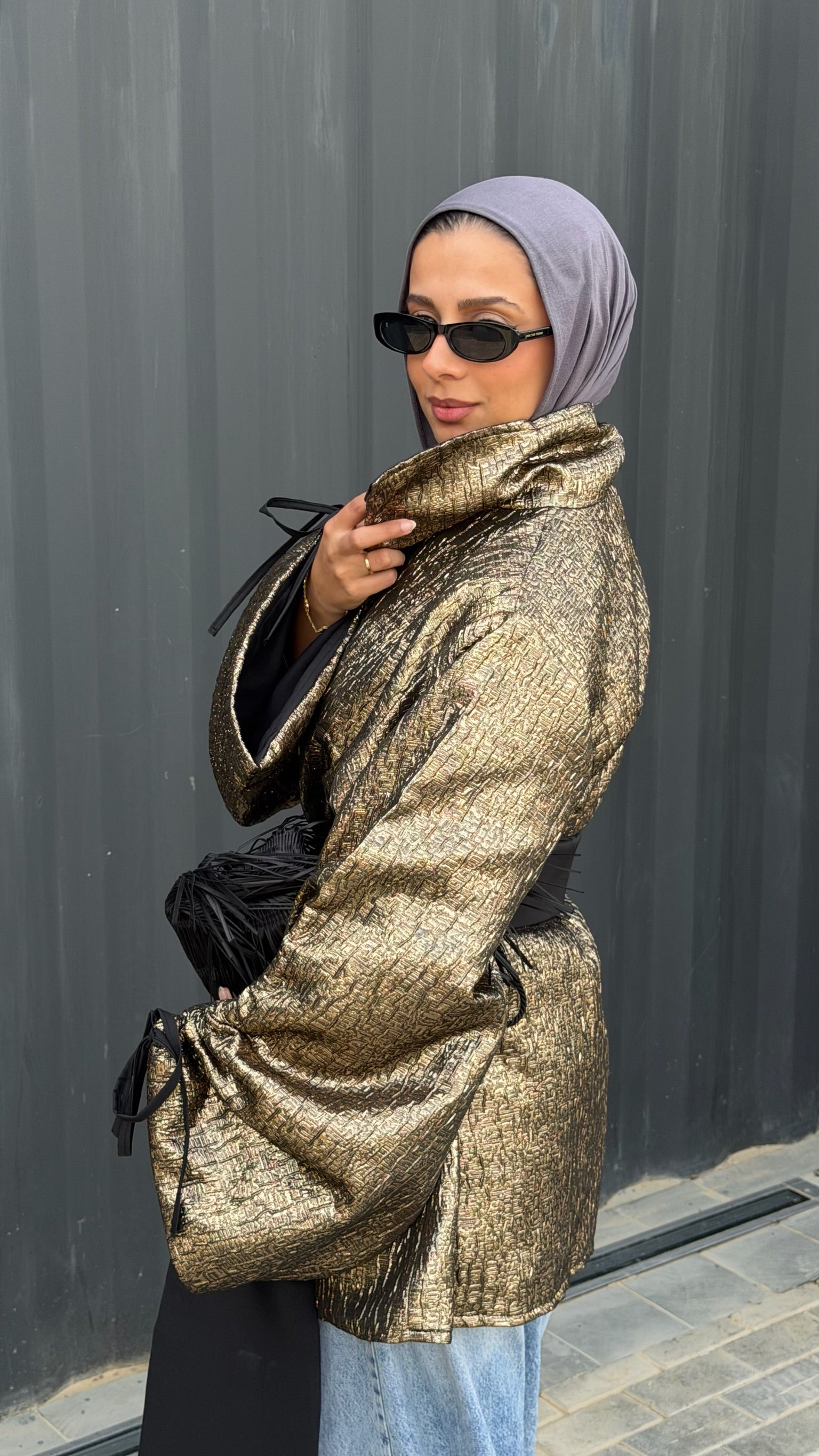 radiant gold foil crinkle that catches every light, contrasted with sleek black accents for drama . Dramatic puffed sleeves, high collar, and long wrap ties—belt it for structure or let it flow for effortless opulence. Ideal for Ramadan iftar gatherings (that golden glow under evening lights) or elevated year-round outings. One size, pure luxury energy