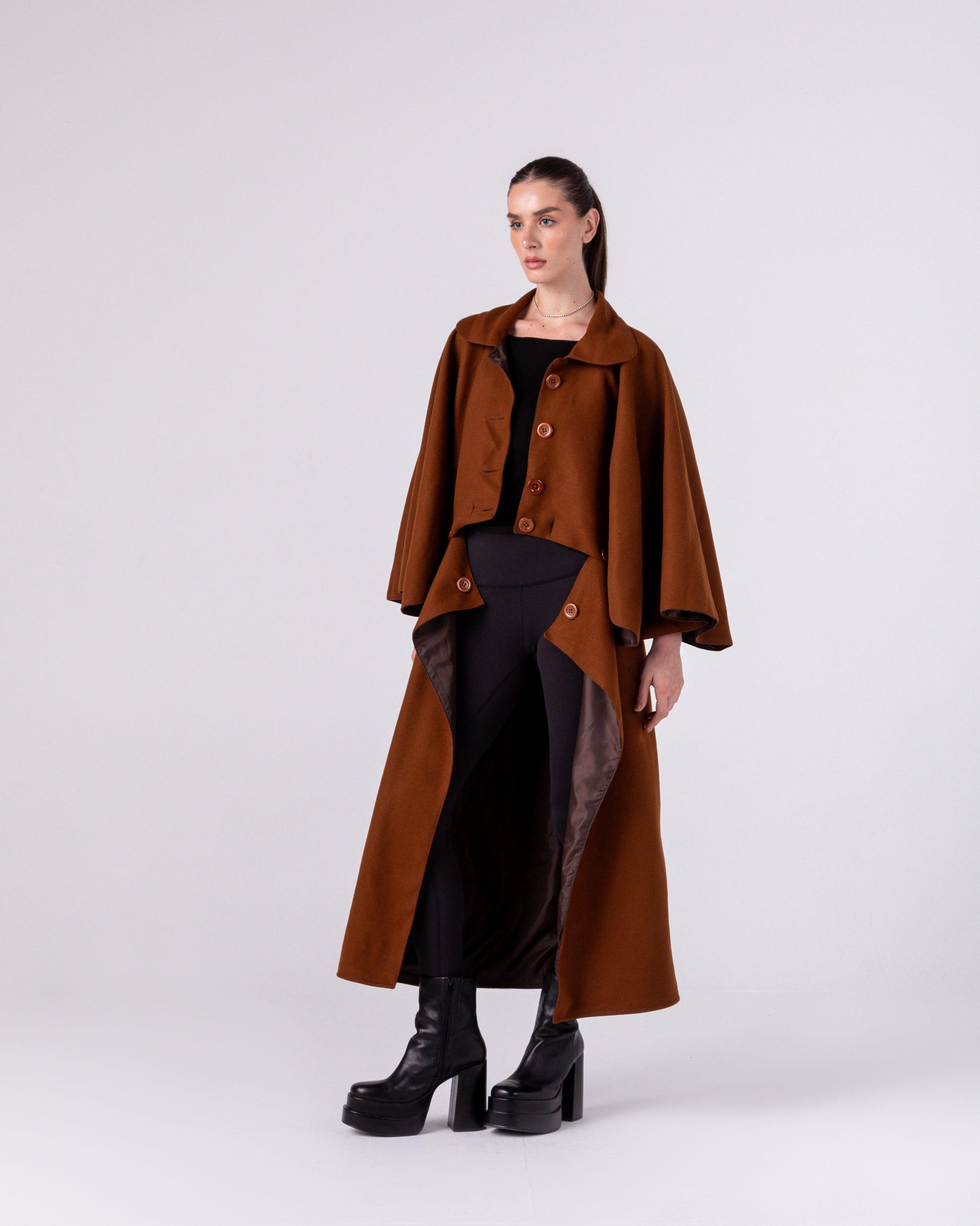 The Janus Coat is a transformative, dual-natured masterpiece crafted from luxurious heavy-weight wool felt in deep tobacco brown and in crème . Engineered for radical reinvention, it features a fully detachable lower section that separates at the waist via a precise row of oversized resin buttons running along the interior waistline. Fasten them all for a commanding floor-length maxi coat with sweeping flared volume, or release them to instantly convert the piece into a sharp, structured cropped cape-jacket. The lower panel can also be partially buttoned, leaving one side trailing dramatically for an asymmetric, sculptural silhouette.