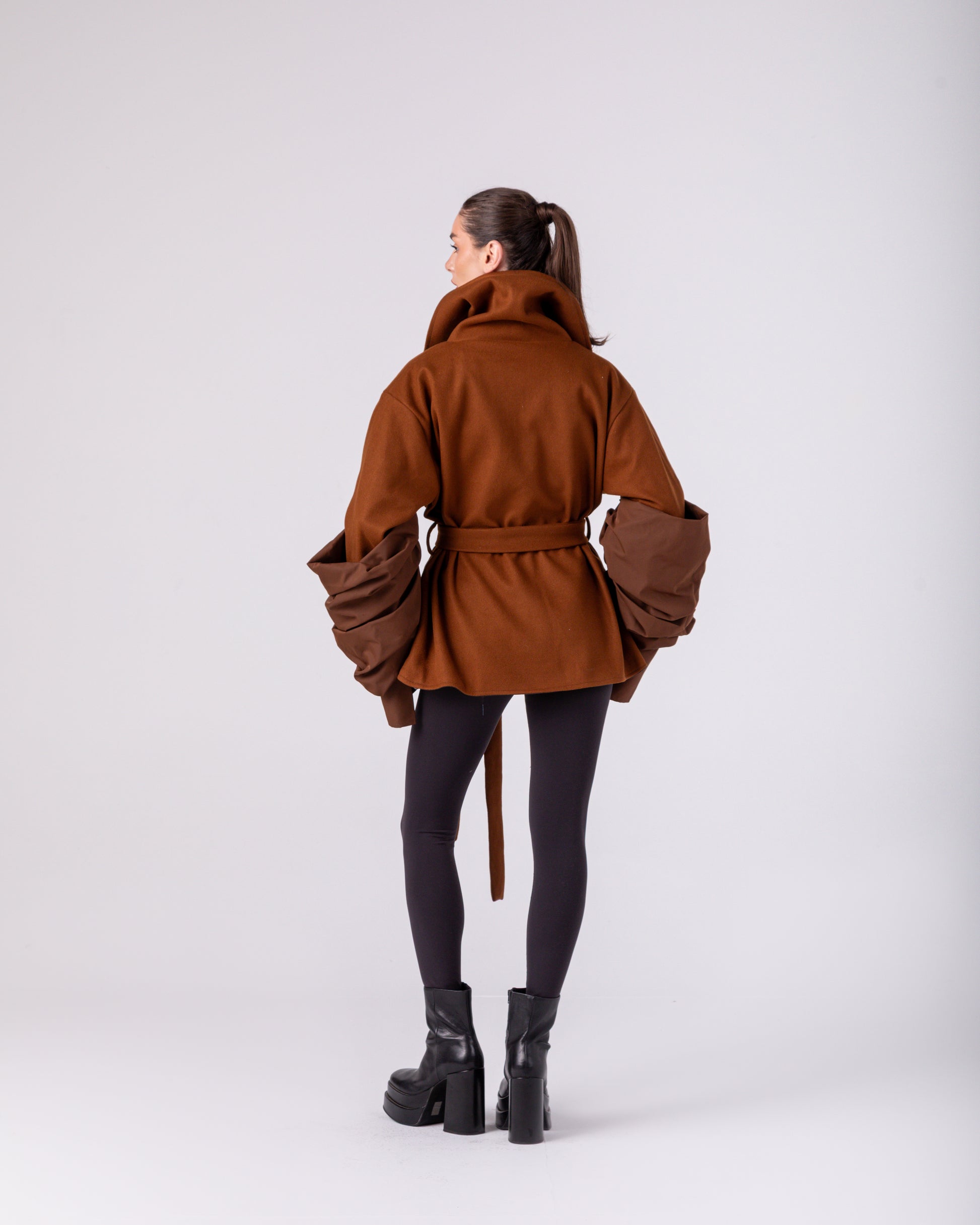 Monolith Jacket – an uncompromising statement in sculptural outerwear. Crafted from dense, structured wool felt in deep rust brown and in crème , it features an exaggerated high collar, dramatically oversized sleeves with gathered cuffs, and a wide self-belt that transforms its silhouette from boxy power to cinched precision. Minimal seams, maximum presence. Wear it belted for sharp authority or loose for quiet dominance – either way, this is architecture you put on your body.