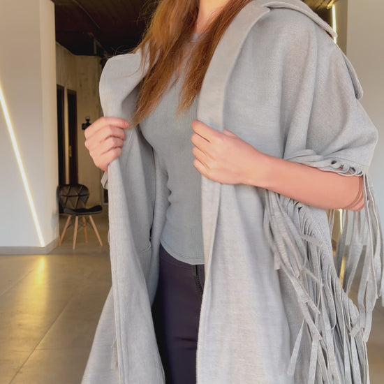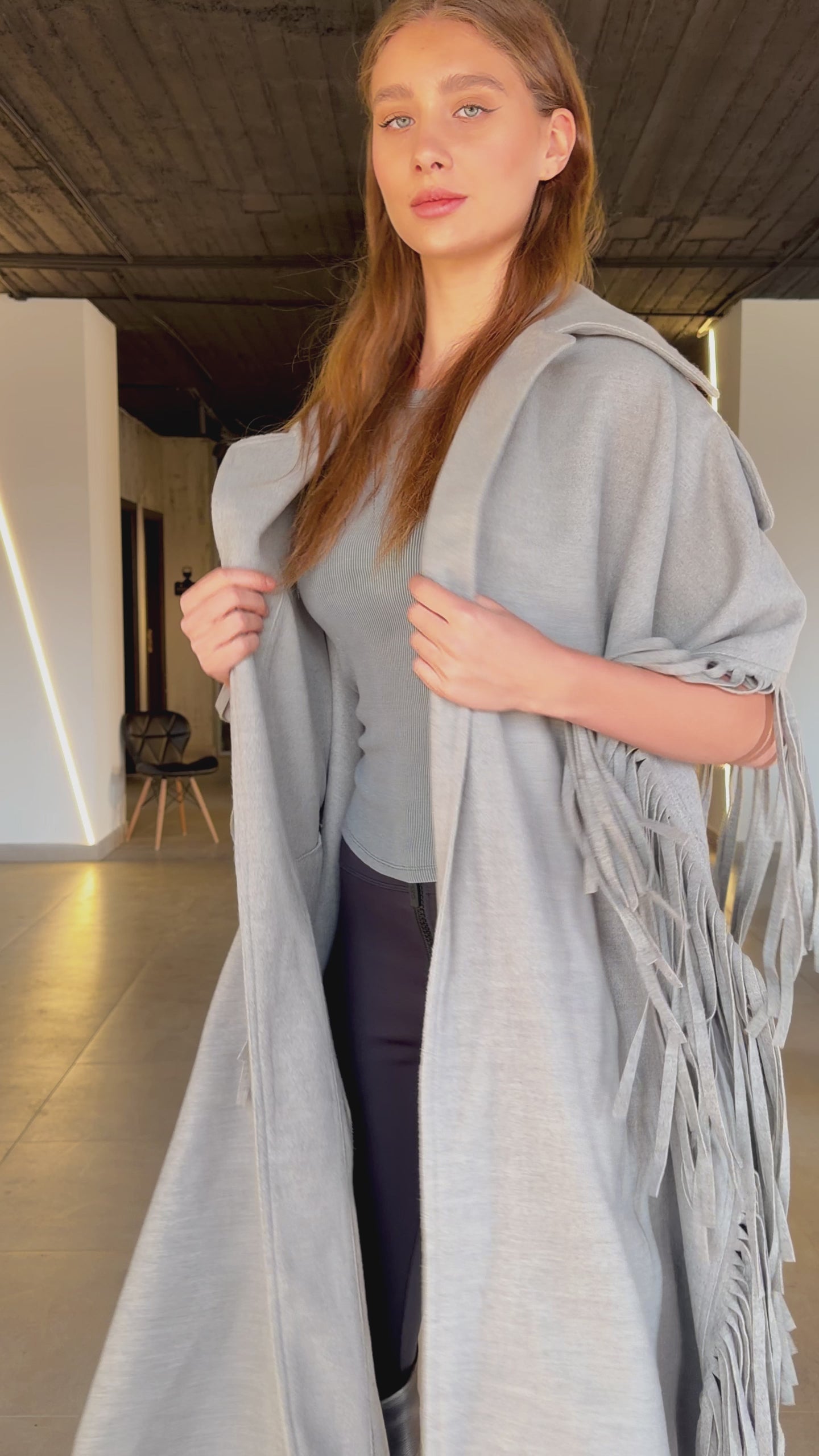 The Nomad Fringe Cape is a free-spirited hybrid of coat and cape, crafted from soft, heavy-weight wool felt in a cool light-gray melange. Cut with a dramatically shortened back that ends just below the waist, it transforms into a sweeping, asymmetrical front that falls to mid-calf, creating fluid movement with every step. Exaggerated fringe cascades along the hem and sleeve edges, swaying like desert wind. A sharp notch collar and clean open front keep the silhouette modern, while hidden arm slits give full mobility without traditional sleeves. Wear it loose for effortless bohemian drama or layer it over chunky knits for quiet rebellion. One size, infinite wanderlust.