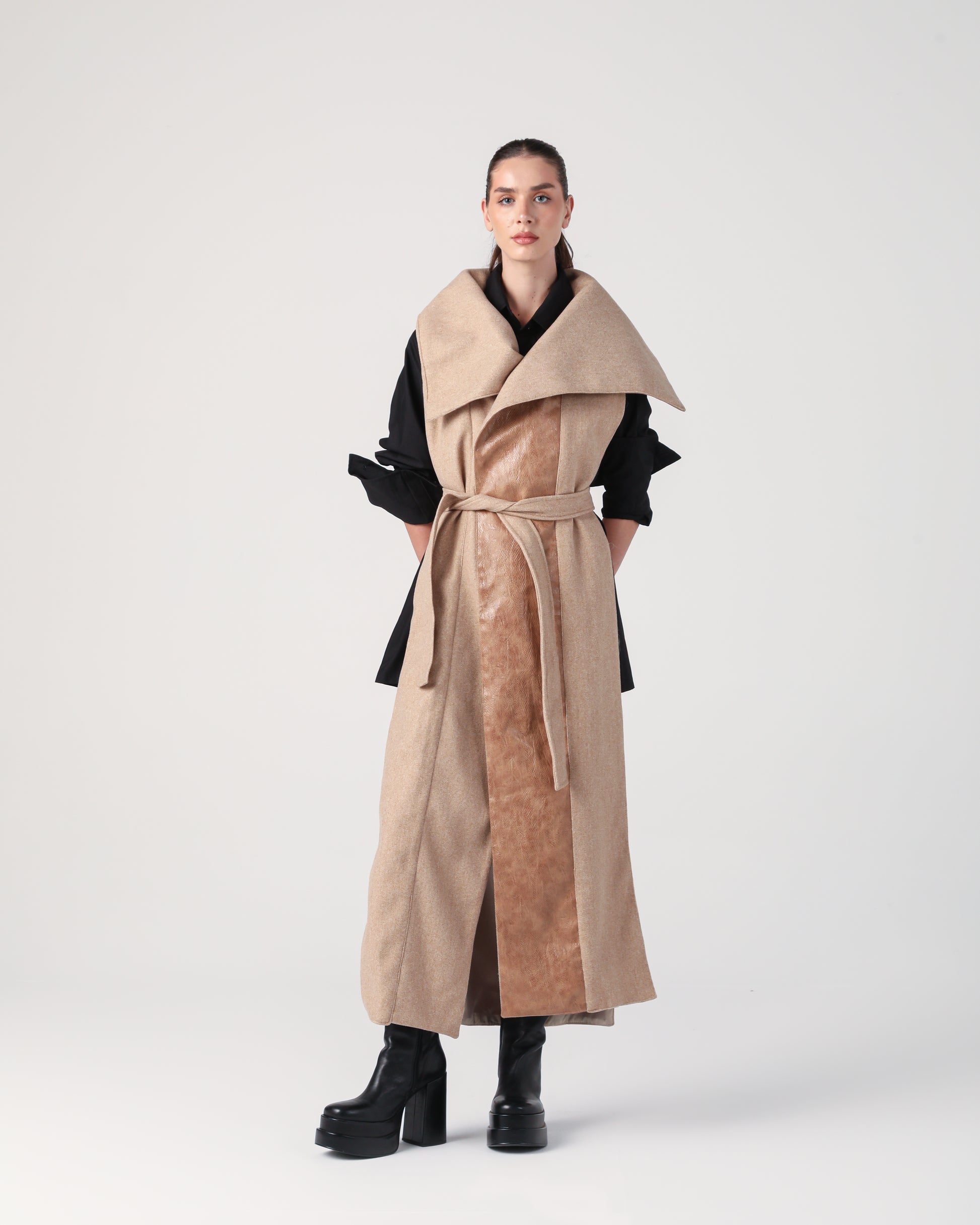 crafted from structured wool felt with a striking faux leather panel cascading down the front for subtle textural contrast. Completely open at the sides with no panels, it drapes with architectural precision. Belt it for sharp definition or leave it free for fluid drama. Flip the dramatic collar up for an instantly commanding, sophisticated edge. Timeless, sculptural, fearless