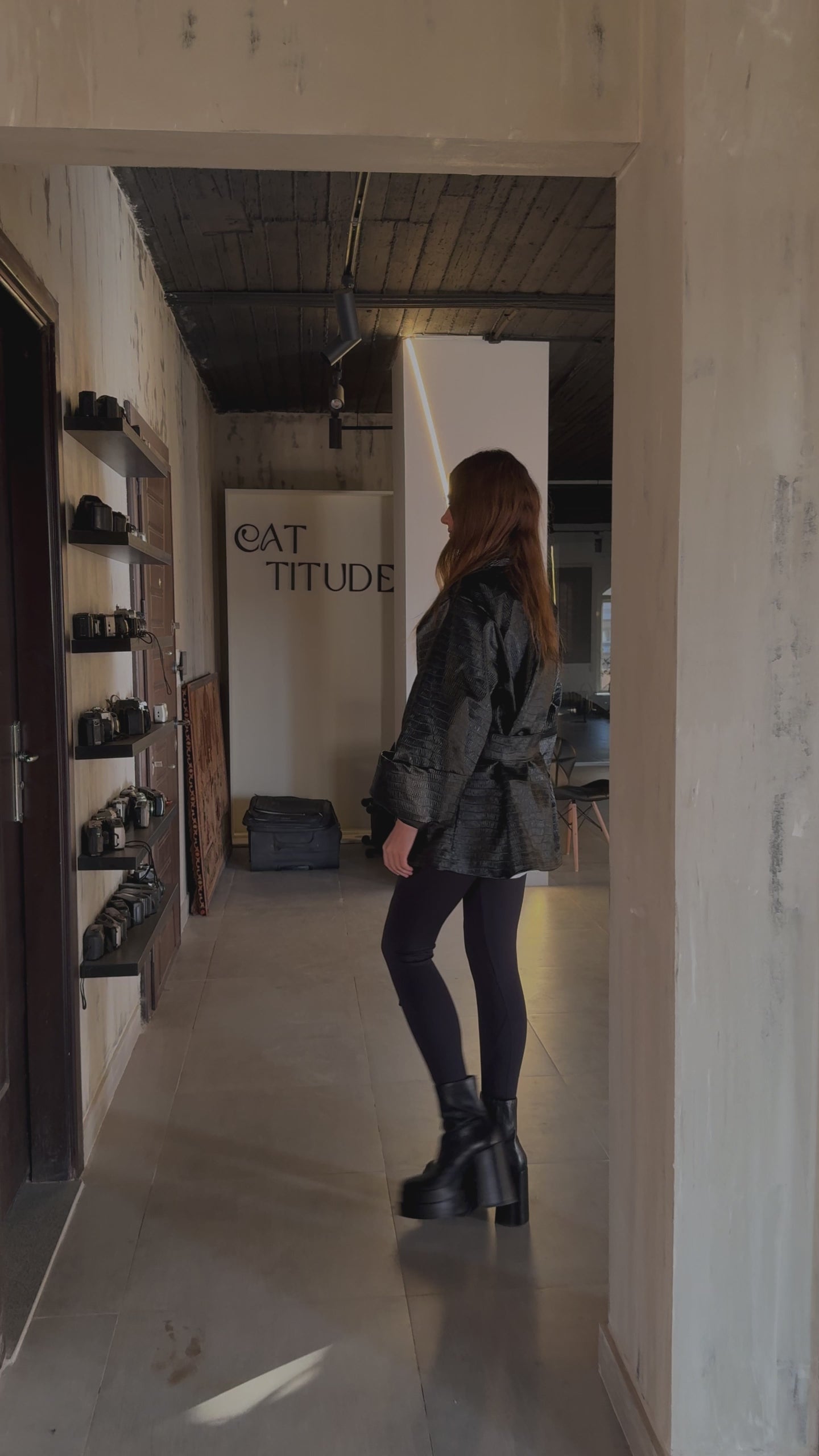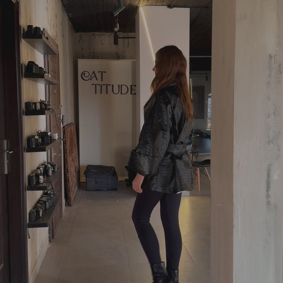 The Obsid Jacket is a sleek, nocturnal power piece crafted from glossy black vegan croc-embossed fabric that gleams like liquid scales under any light. An oversized, razor-sharp shawl collar cascades over the shoulders, while ultra-wide bell sleeves flare dramatically like dark wings. The clean wrap-front silhouette is held together solely by its matching self-belt: tie it tight for a sculpted, commanding shape or leave it loose for effortless menace. Oversized patch pockets and a silky lining add subtle luxury. Bold, unapologetic, and fiercely elegant, this is night-armor for those who own the shadows. One size, total dominance.