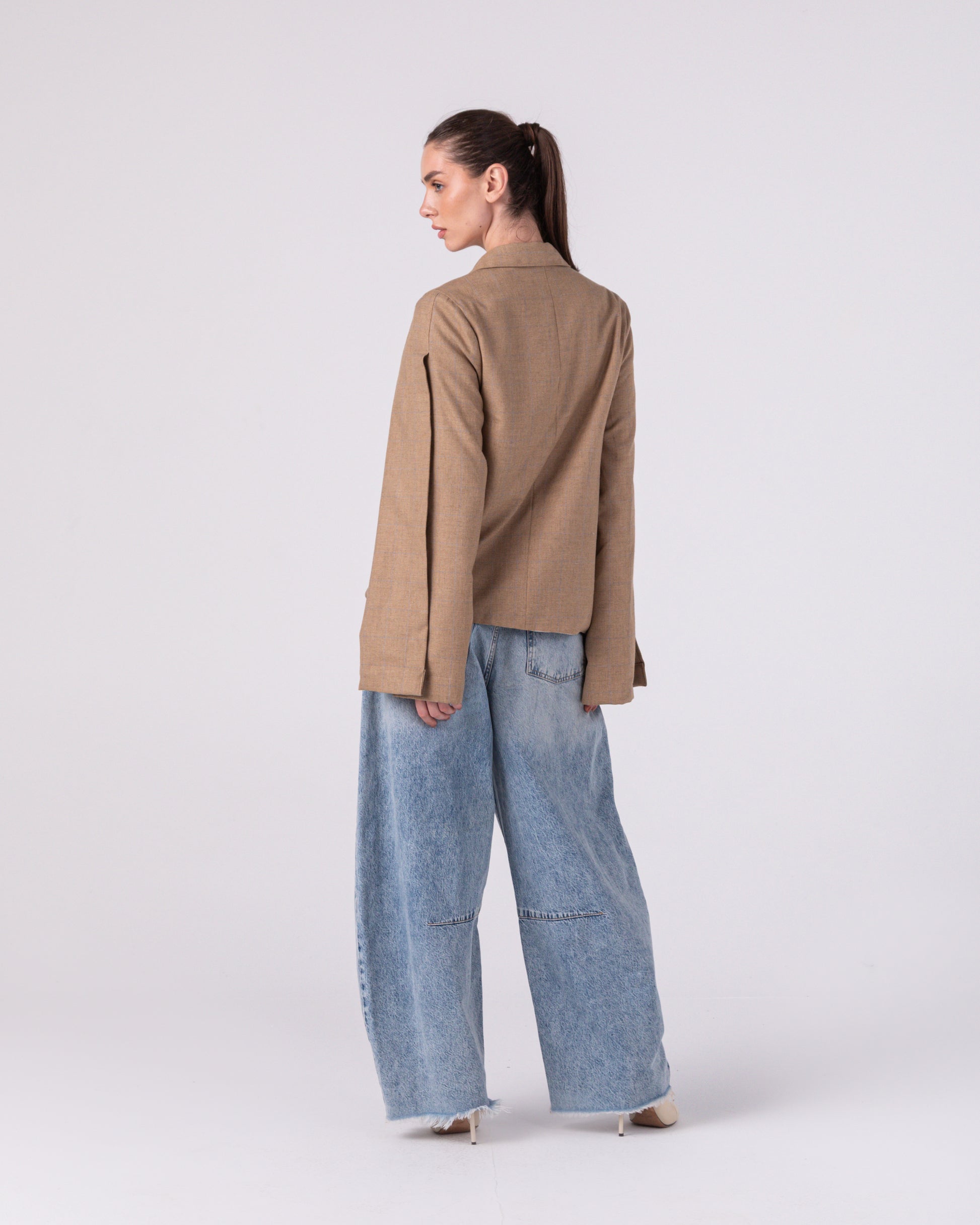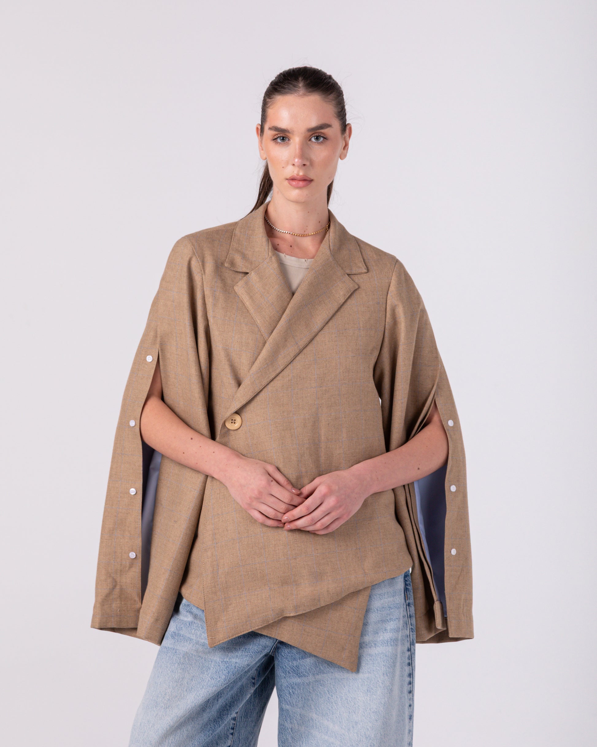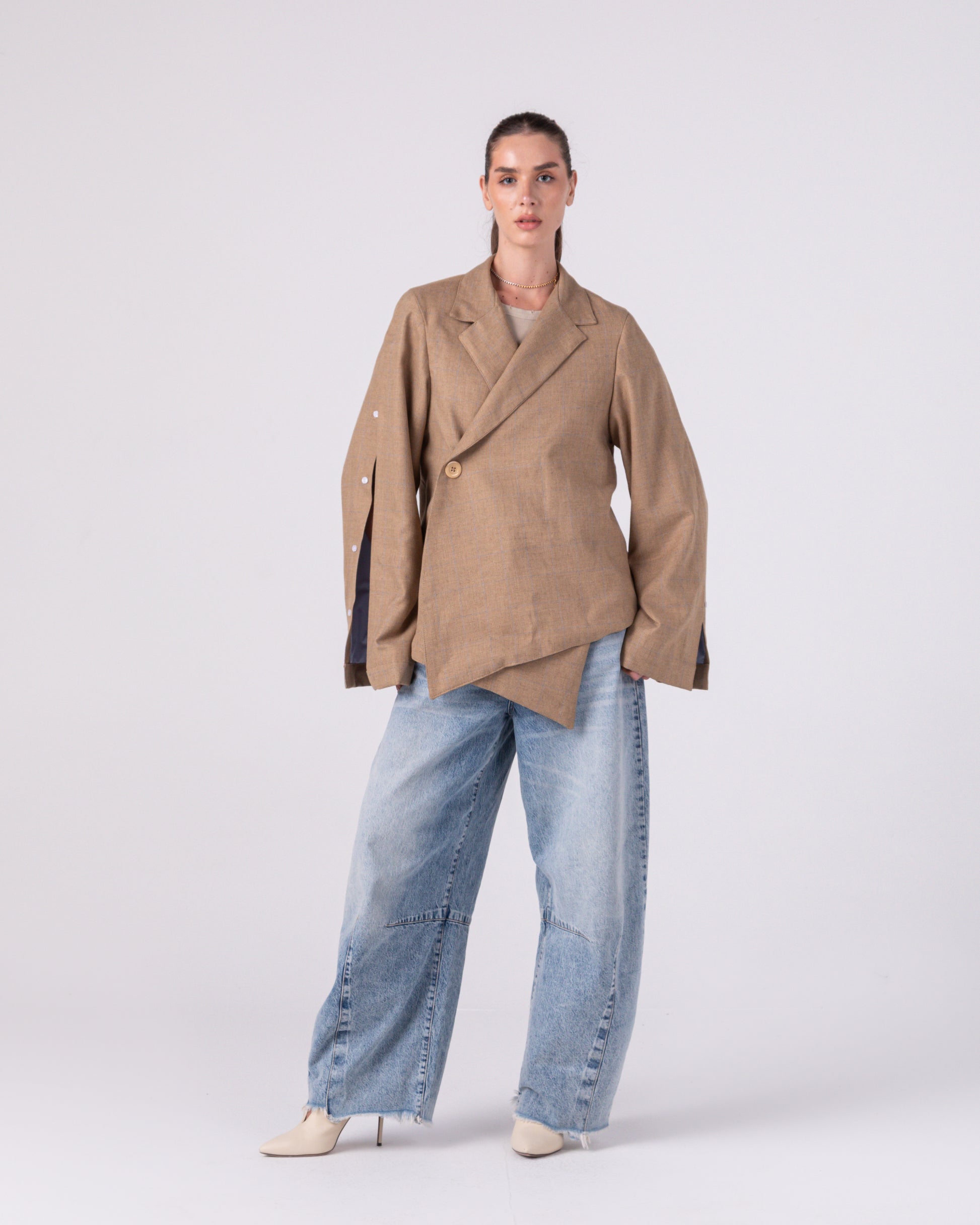 The Phantom Blazer is a masterful illusion of structure and freedom. Cut from a luxurious camel wool-linen blend with crisp notched lapels and a single oversized horn button on the asymmetrical front, it reads as a classic tailored blazer at first glance. Then the sleeves reveal their secret: full-length cape slits edged with functional buttoned cuffs that transform them from flowing drapes into fitted sleeves in seconds. A soft baby-blue poplin lining peeks through the openings, creating a cool flash against the warm camel tone every time you move. The elongated, pointed front hem floats dramatically while the back stays sharp and cropped. Tailoring that disappears and reappears like a phantom. One size, pure magic.