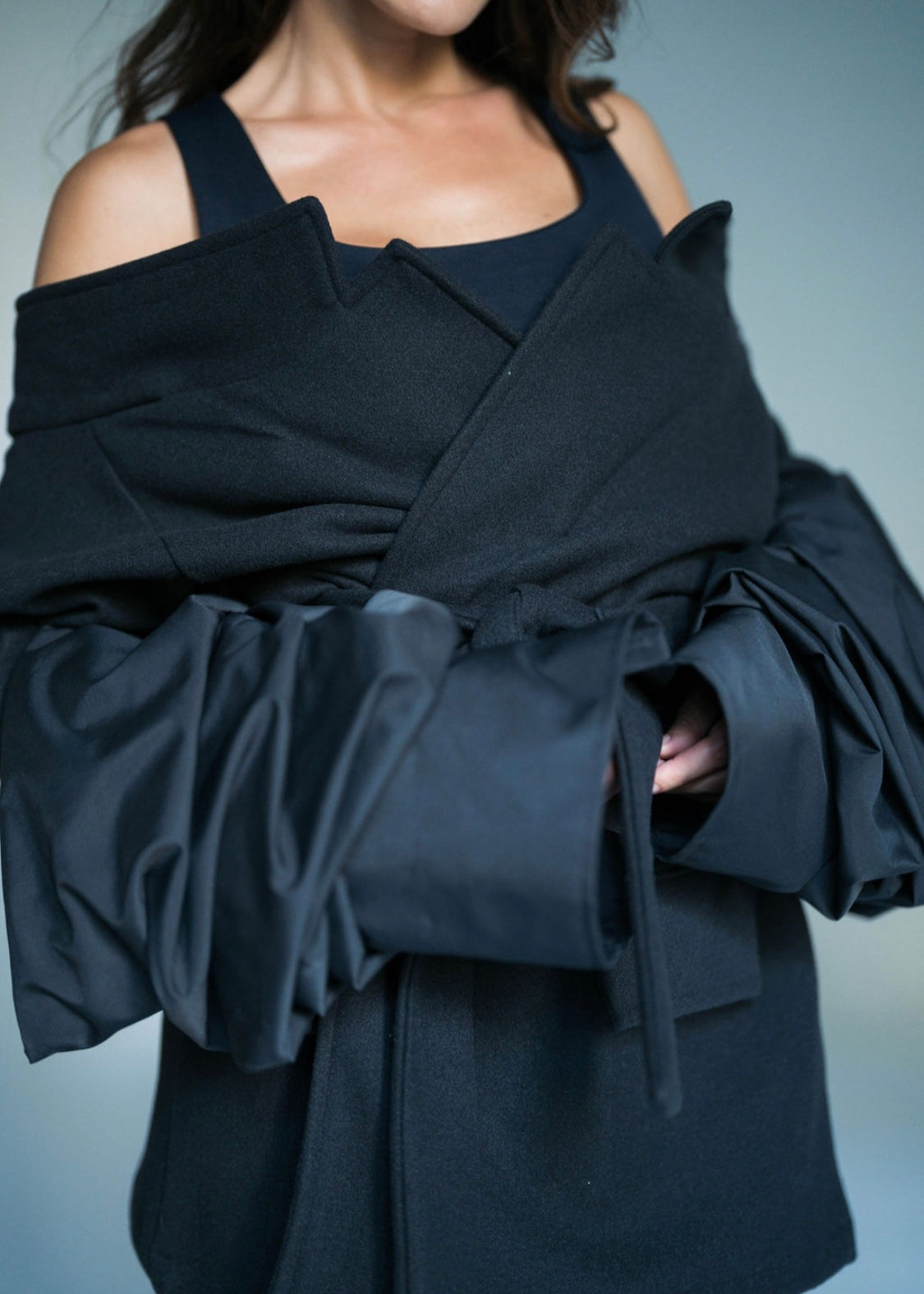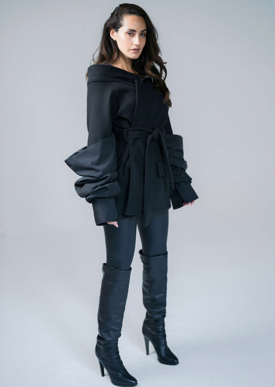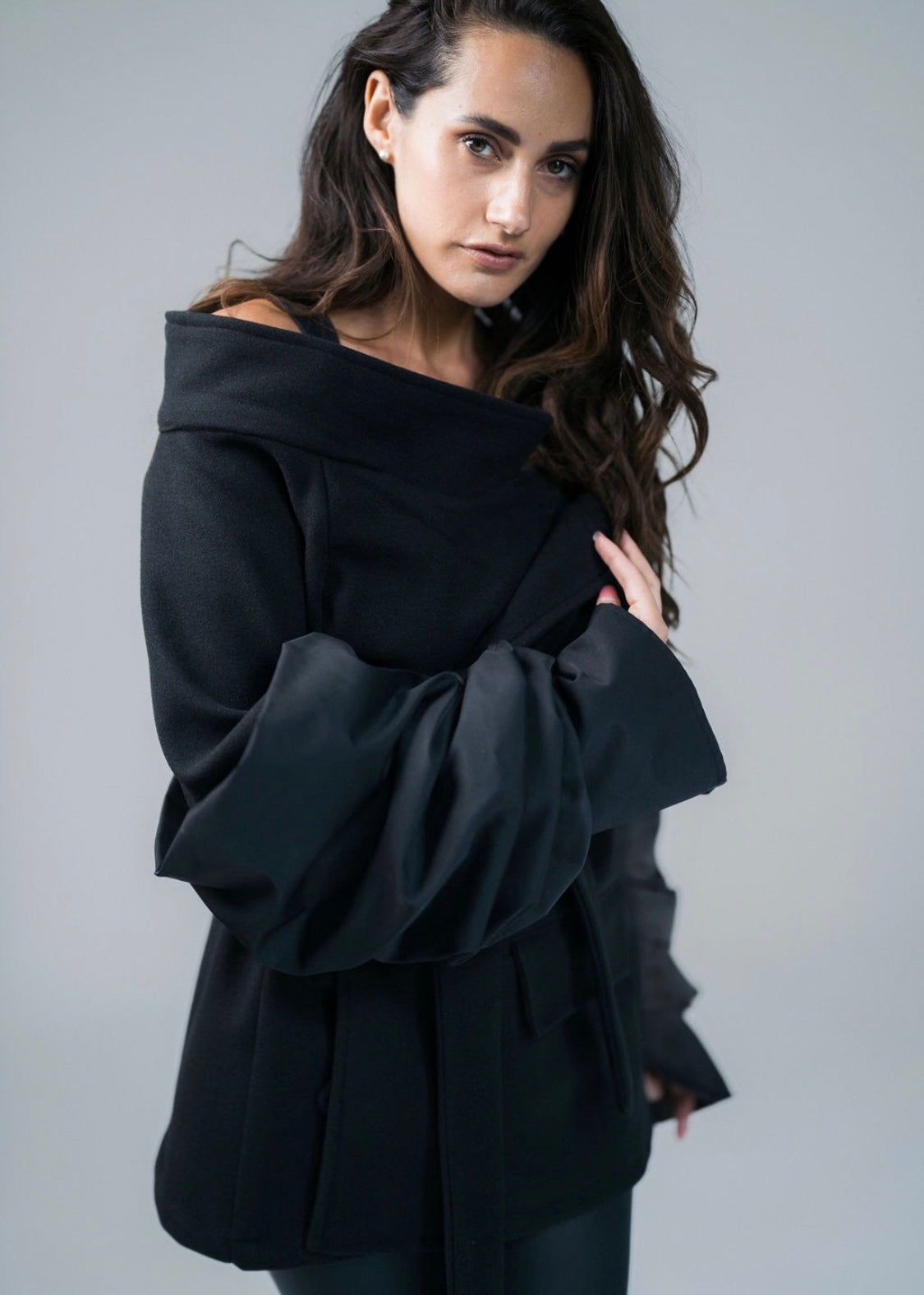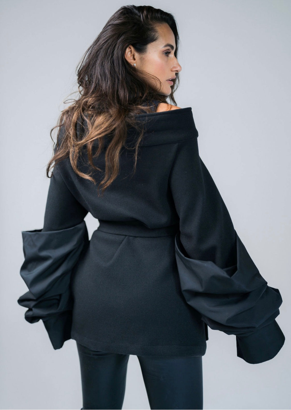 Turn up the drama with this black broadcloth jacket, a bold blend of chic elegance and edgy design.