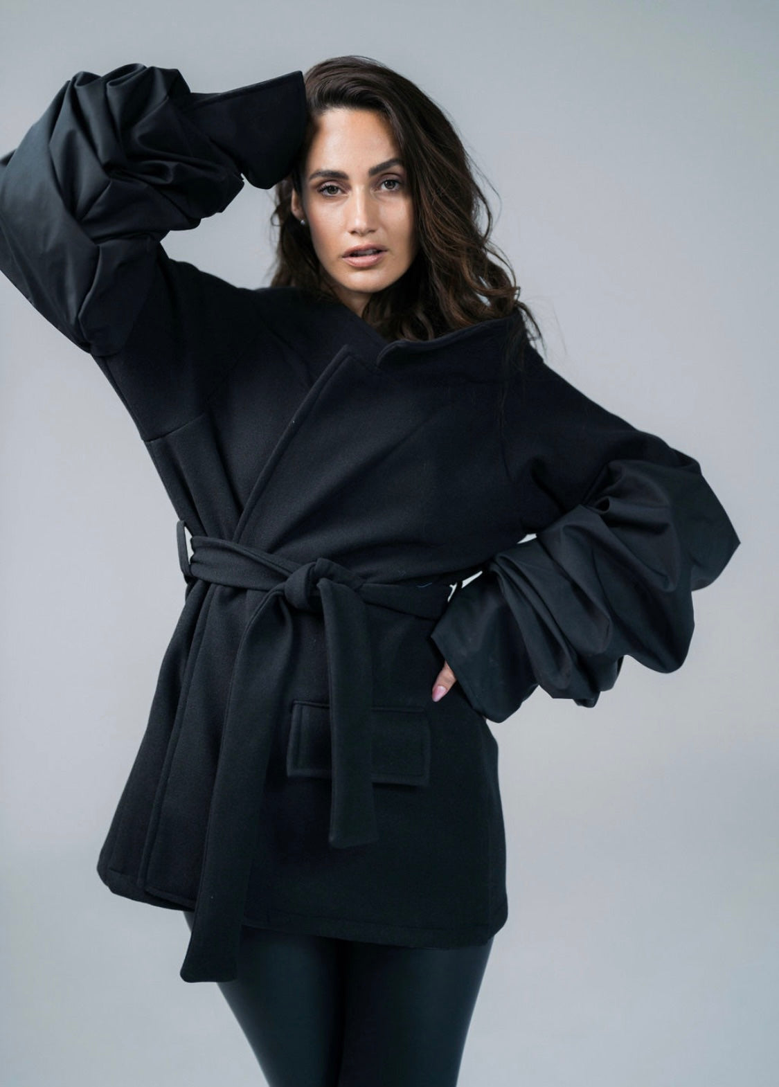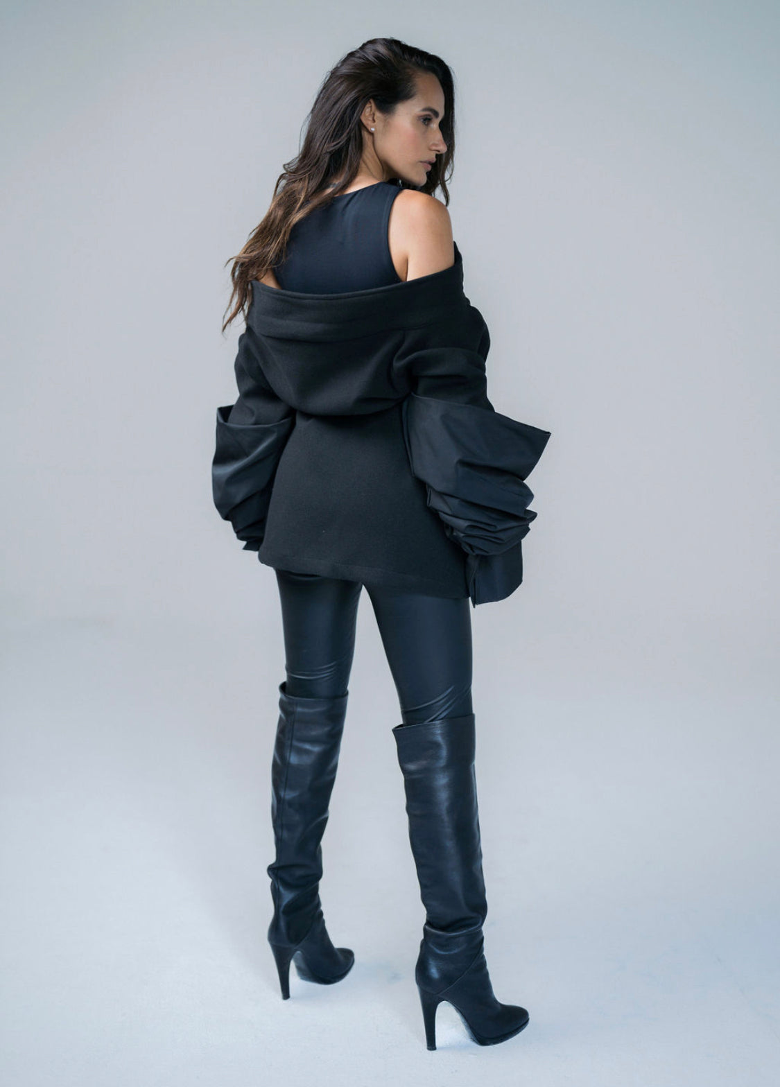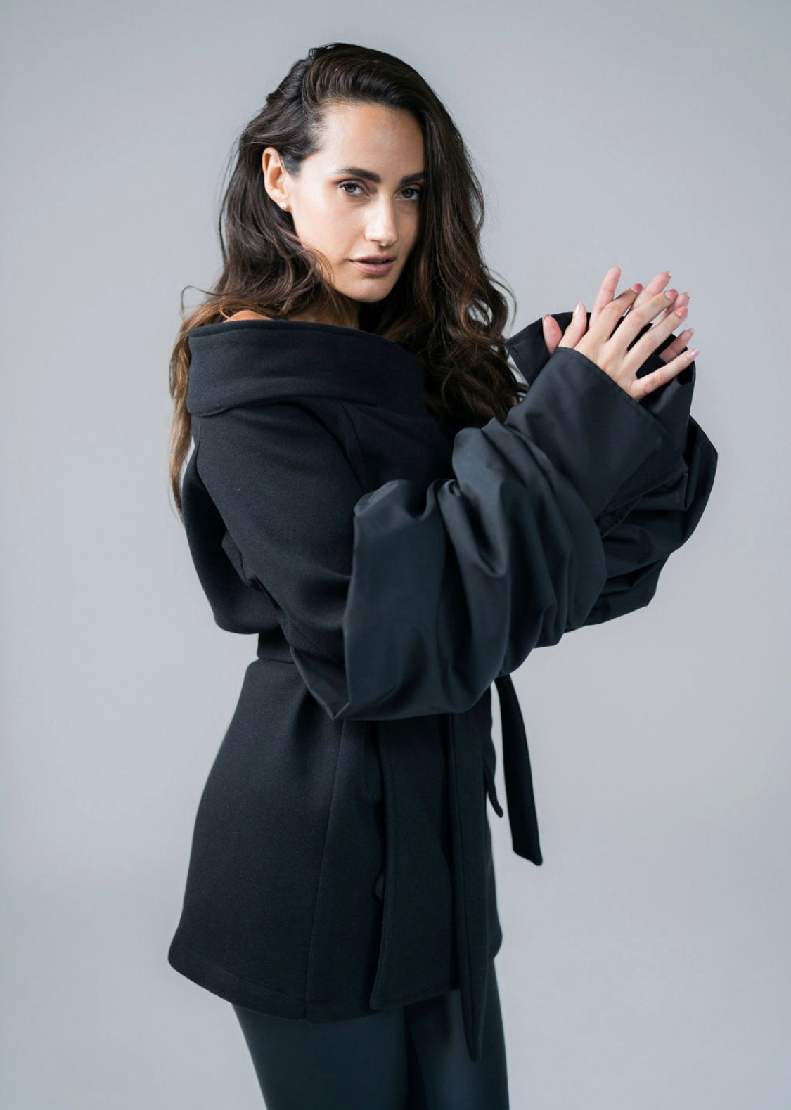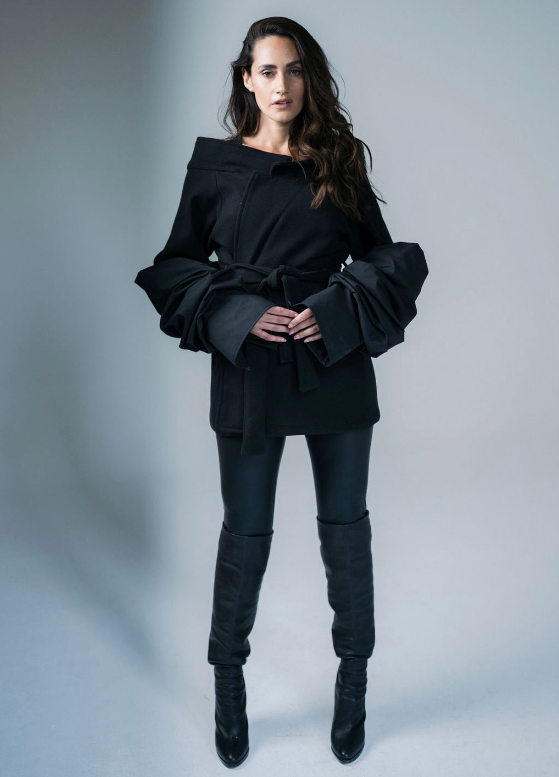 Turn up the drama with this black broadcloth jacket, a bold blend of chic elegance and edgy design.