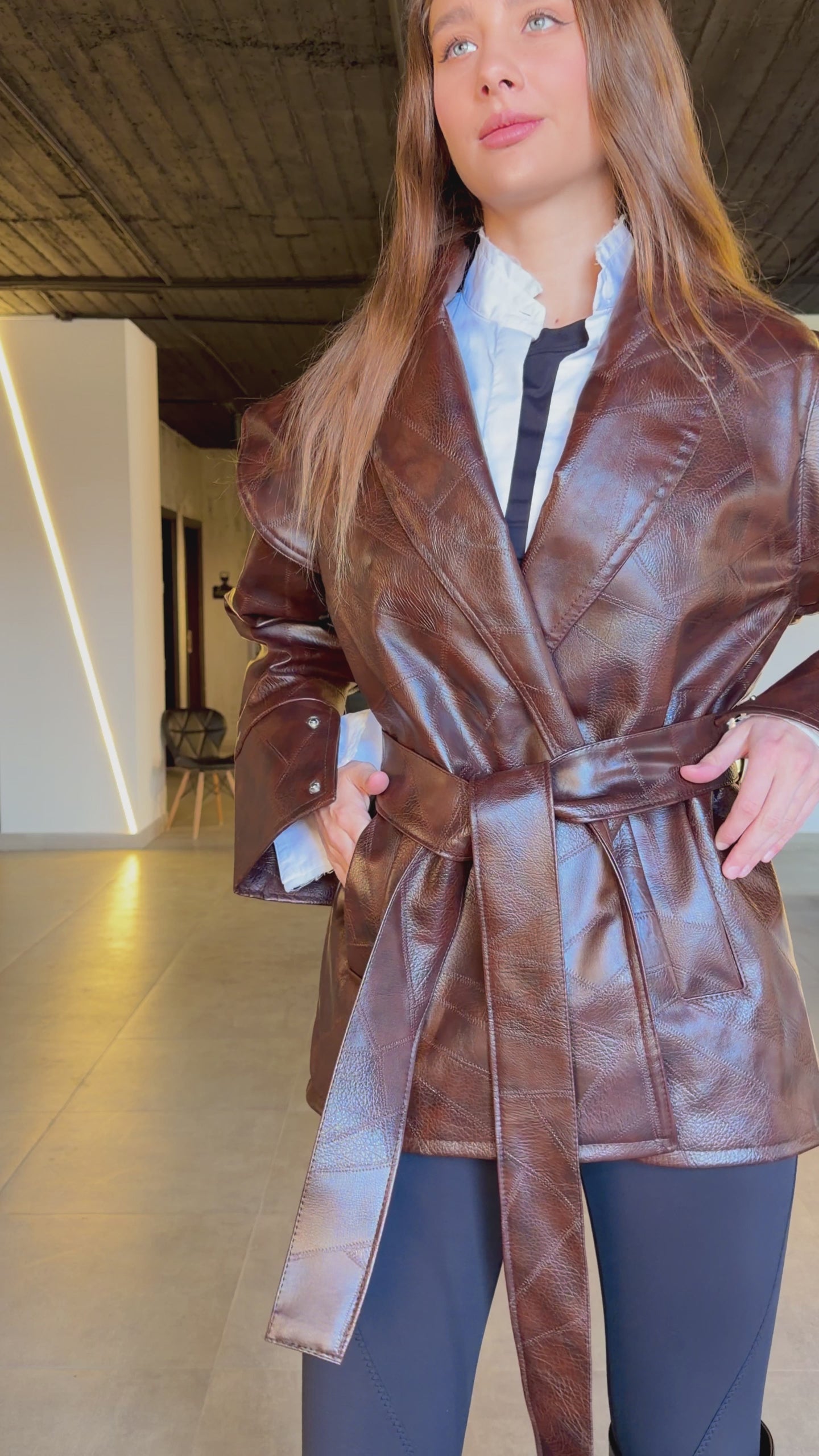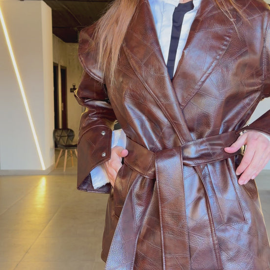 The Empire Wrap is a bold, oversized statement piece crafted from rich espresso high-shine vegan leather that perfectly mimics the look and feel of distressed lambskin. Its dramatic wide shawl collar falls like a cape over the shoulders, while dropped kimono sleeves with deep turn-back cuffs add sculptural volume. The clean wrap-front silhouette is secured only by a matching self-belt (cinch it tight for structure or let it hang loose for effortless power). Finished with oversized patch pockets and a smooth silk lining. Cruelty-free, undeniably striking. One size, total dominance.