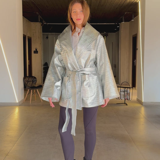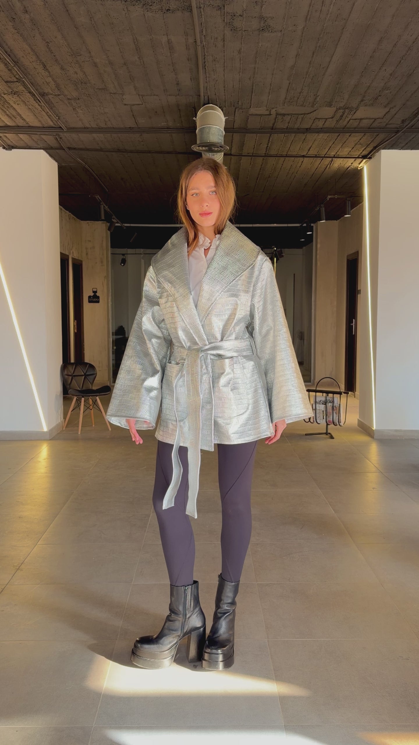 The Mercury Jacket is a futuristic, liquid-metal statement piece crafted from high-shine silver vegan croc-embossed fabric that reflects light with every movement. Cut with an exaggerated, sculptural wide shawl collar that folds dramatically over the shoulders, it features ultra-wide bell sleeves that flare like molten wings, a clean wrap-front silhouette, and a matching self-belt to cinch the waist for sharp definition. Oversized patch pockets and a silky lining add function without breaking the sleek, metallic flow. Lightweight yet structured, waterproof, and unapologetically bold, this is outerwear designed for those who want to look like they just stepped out of a sci-fi dream. One size, maximum impact.