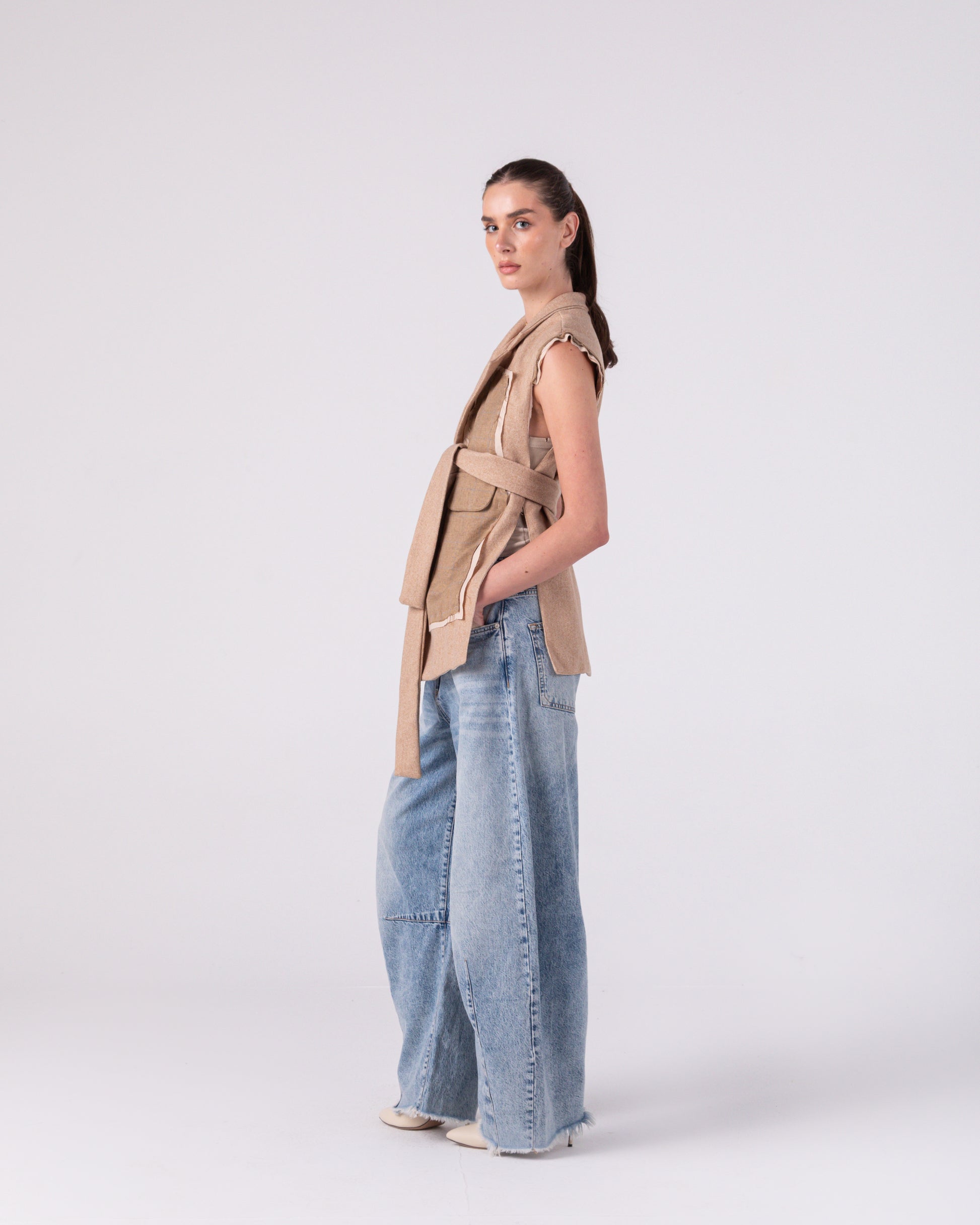 The Raw Architect Vest is an exercise in controlled deconstruction. Cut from substantial camel wool-linen with deliberately unfinished raw edges that fray from the shoulders, and from the front patch work , it turns imperfection into intention. A wide notched lapel and deep V-neckline keep the tailoring sharp, while an integrated wide belt cinches the waist to create an exaggerated hourglass silhouette. Fully open at the front (no buttons, no closures), it’s meant to be worn as a sculptural layer that frames whatever is beneath. The back is clean and slightly curved for movement. Lightweight yet structured, quiet yet defiant. One size, maximum edge